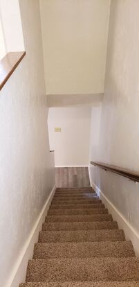 The home features two bedrooms upstairs, with a full bath, and beautiful laminate flooring downstairs. The stairs and bedrooms are carpeted for added comfort. The unit includes a washer and dryer for your convenience.