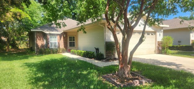 Welcome to this charming 3-bedroom, 2-bathroom patio home located in the desirable Blues Creek community. Featuring a bright, open floor plan with high ceilings, updated flooring, fresh paint, and abundant natural light, this home offers both style and comfort. The kitchen provides ample counter space and storage and flows seamlessly into the dining area and spacious living room—perfect for entertaining. The primary suite includes a walk-in closet, dual-sink vanity, and a walk-in shower for your comfort and convenience. Step out back to a private patio overlooking a peaceful wooded area—ideal for relaxing or enjoying your morning coffee. The attached 2-car garage adds extra convenience. Community amenities include a pool, clubhouse, and tennis/pickleball courts. Yard maintenance is included in the rent. Conveniently located near Publix, restaurants, and shopping, this home has everything you need for comfortable, low-maintenance living. ** Only 1 small dog allowed 30lbs Nonrefundable pet fee in the amount of $250.00 *** TENANT PLACEMENT - WATSON DOES NOT MANAGEMENT *** Renter's insurance required**