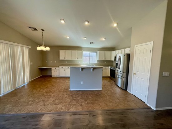 Open-Concept layout: Seamlessly connecting the great room, dining area and a modern kitchen with tall vaulted ceilings and new wood look flooring in the great room. Home has been recently painted a light neutral color too.