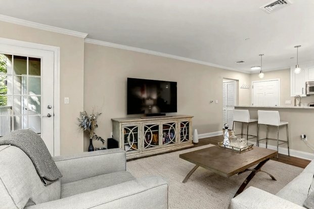 The open kitchen with new cabinets, new marble countertops, stainless steel appliances and breakfast bar opens to the sunny living room with door to the balcony with woodland views. New flooring in unit. Updated bathroom with quartz countertops and marble throughout. Washer and dryer in unit. 1 reserved indoor garage parking spot #25 and 1 reserved space #45 outdoors.