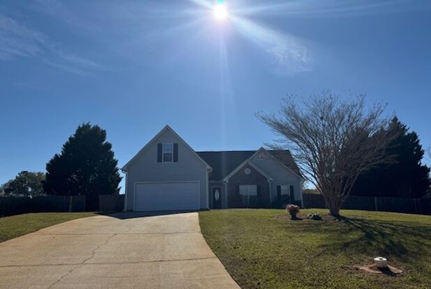 Welcome to this beautifully updated 4-bedroom, 2-bathroom ranch home nestled in a peaceful cul-de-sac. This home features fresh paint throughout and new vinyl flooring in the kitchen and bathrooms, creating a modern, inviting atmosphere. The spacious kitchen includes granite countertops, sleek black appliances, a cozy breakfast area, and spacious oak cabinets offering plenty of storage. The large family room, complete with a cozy fireplace, is the perfect space for relaxing and entertaining, while the separate dining area adds an elegant touch for formal meals. Vaulted ceilings throughout the main living areas create an open atmosphere and adds a touch of grandeur to the room. The primary bedroom is a true retreat, featuring vaulted ceilings, an en suite bath with double vanity, granite countertops, a separate shower, and a luxurious soaking tub. The three secondary bedrooms are generously sized, each featuring ceiling fan light fixtures for comfortability. Upstairs, you’ll find a versatile bonus room that can be utilized as a 4th bedroom, home office, or a home theater—whatever best fits your lifestyle. Step outside to your huge backyard, fully fenced for privacy, offering plenty of space for outdoor activities, gardening, or simply unwinding. The 2-car garage provides additional storage space and convenience.