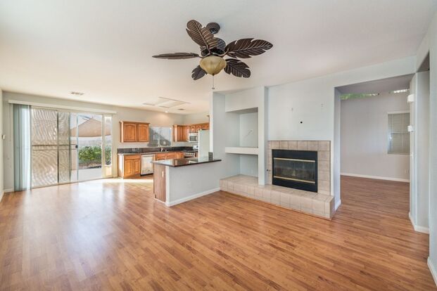 LOCATION LOCATION LOCATION! Nearly 2400 sqft 5 bed/3 FULL bath home on totally PRIVATE ELEVATED LOT. L-SHAPED sparkling HEATED POOL & SPA! Zoned for 3 TOP schools! Ultra upgraded: SLAB GRANITE / STAINLESS STEEL KITCHEN w/micro & undermount sink! 100% 'WOOD' & tile flooring, NO CARPET,great for allergies! TWO BEDROOMs DOWN+FULL BATH DOWNSTAIRS, great for multi-gen! Huge Primary bedroom w/ WALKIN CLOSET, dbl sinks, separate tub/shower, bay window sitting area! Kitchen overlooks separate family room w/cozy fireplace, elegant vaulted living+dining rooms. Fully landscaped with large patio and large pine trees. Tucked in coveted 89052 within Sunridge@ MacDonald Ranch ,Near huge Sunridge Park w/playgrounds,basketball,baseball,tennis courts,BBQs & green fields. 6 CEILING FANS & solar screens SAVE $$$! Custom lighting & paint,custom built-ins, soft water. COMPARE THE VALUE