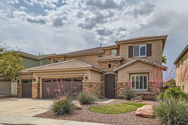 Gorgeous 5 bdrm, 3 1/2 bath, 3 car garage in gated community with Strip, City and Mountain Views! 3668 square feet to enjoy, including a loft and media room. Balcony from the primary bedroom and loft have strip and mountain views! Primary bedroom downstairs with oversized jetted garden tub, separate double sinks, walk in shower with dual heads. 75 gallon water heater to fill the luxurious tub. Gourmet Kitchen featuring 42" cabinets, walk-in pantry, double ovens, gas stove, Bosch refrigerator, brand new dishwasher, granite countertops, breakfast bar. Shutters throughout. Solar and next thermostat.
