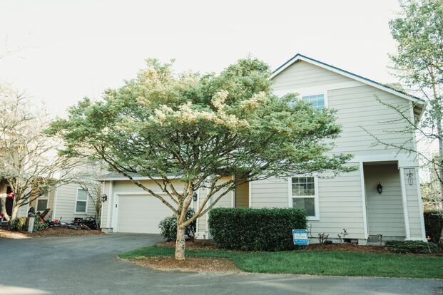 Step inside this light filled home with soaring ceilings. Den on main level with slider door to small patio. Rest of the main level has laminate floors. Open floor plan with gas fireplace in living area and beautiful chandelier in dining area with slider door. Kitchen has eating bar perfect for bar stools, granite counters and includes dishwasher, electric range, refrigerator and microwave. Also located on the main level are the half bath and laundry which includes washer & dryer. Head upstairs and you'll find 3 bedrooms and 2 bathrooms and a view to the main level. Many windows throughout the home allow natural light to brighten the space. Primary bed features laminate floors and multiple windows for great lighting. Primary bath includes double sinks, stand up shower and walk in closet. Down the hall is the 2nd bath with shower/tub combo. 3rd upstairs bedroom is oversize with carpet and walk in closet. Home has forced air gas heat and central AC. 2 car attached garage with opener. Minutes to multiple Intel locations, Hillsboro Airport, Costco, parks & much more! NO pets. Resident responsible for all utilities. HOA maintains yard. NO smoking/vaping.