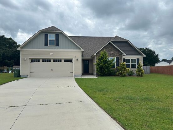 This charming 3-bedroom, 2-bathroom residence located in the desirable Tides End Community is nestled in the heart of Holly Ridge, NC. This home boasts a spacious master suite on the first floor, complete with a large walk-in closet and a master bath featuring a dual vanity. The kitchen is a chef's dream with a functional island for extra prep space. An upstairs bonus room offers additional space for your needs. The large fenced backyard is perfect for outdoor activities and comes with an outdoor fire pit, perfect for those cool evenings. This home is conveniently located close to coastal elementary, the beach and a public boat ramp, making it an ideal choice for those who love water activities. Please note, no dangerous breed dogs or mixes with dangerous breed dogs are allowed. Tenants are responsible for verifying the square footage, which is derived from tax records. Experience the best of coastal living in the Tides End Community with this beautiful home.