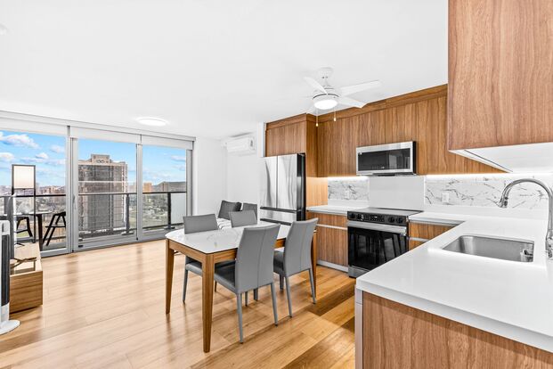 Step inside to a bright, open layout featuring a contemporary kitchen with stainless steel appliances, quartz countertops, and sleek cabinetry. The spacious bedroom offers ample closet storage, while the bathroom is finished with clean, modern touches.