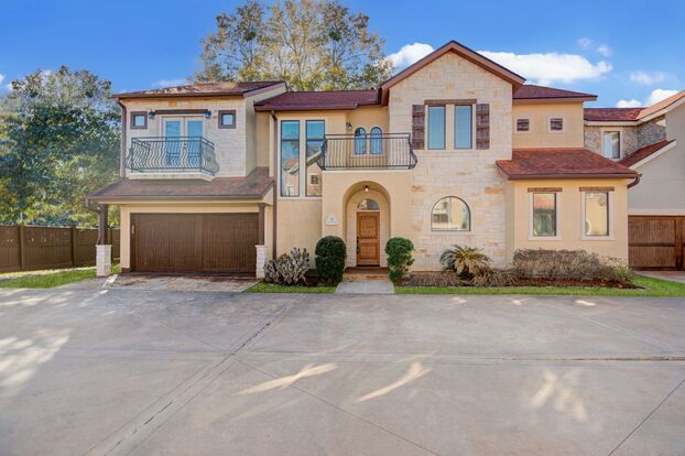Enjoy quiet living in this stunning Tuscan-style home in a small, gated, 12 home neighborhood. Its location provides easy access to I-10, Memorial City, Energy Corridor, and Town & Country. The living room, kitchen, and study are located on the first floor. A 2-sided, stone fireplace opens to both the living room and the study. Floors are stained concrete. The primary suite is on the second floor and has a door that opens to a private balcony overlooking the entry. The primary bathroom has dual vanity sinks, custom cabinetry, natural stone counter, private water closet, and a large walk-in closet. All secondary bedrooms also enjoy their own private balcony! The backyard is fully fenced, with a covered patio, and is the perfect place for a tranquil sitting area!