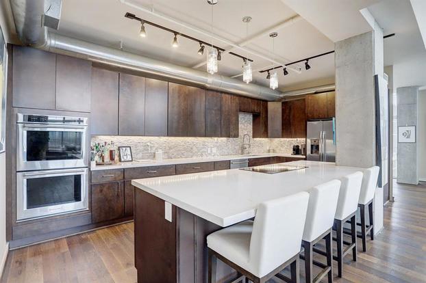 This gorgeous 2 bed, 3 bath Greater Uptown penthouse apartment offers 20-35 foot vaulted ceilings, as well as floor-to-ceiling windows for spectacular views. Step inside to the large open-concept floor plan with hardwood floors and updated light fixtures. Plus, a wonderful outdoor patio features panoramic skyline city viewsâitâs the ideal space for outdoor entertaining. The kitchen is a dream with stainless steel appliances, double ovens, a dishwasher, mosaic backsplash, custom cabinets, and quartzite countertops. Thereâs lots of room here to relax, work from home, and socialize with friends. This fantastic apartment also offers lots of storage, air conditioning, an in-unit washer/dryer, and parking.Â