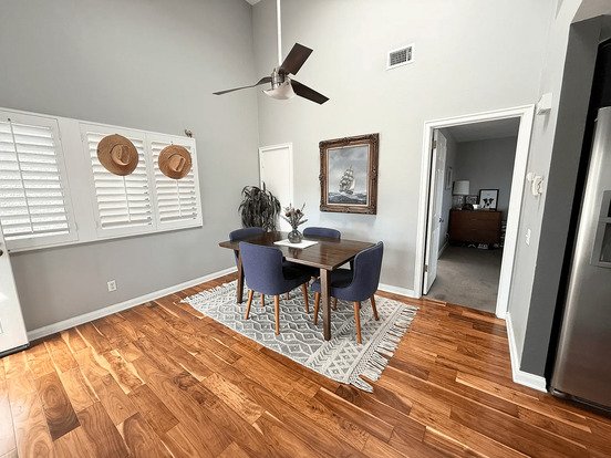 Second floor condo only 1 mile from the beach. High ceilings, wood floors, garage, off street parking, corner unit allowing pets (2 pets max). In the Tiara de la Pacifica community with pool, spa, and close to shops and beach in North Huntington Beach.