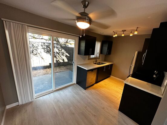 The kitchen has been upgraded with beautiful cabinets and granite counters. The appliances include stainless steel refrigerator, stove and dishwasher. Track lighting allows you to illuminate the kitchen as you please. The dining area just off the kitchen has a modern upgraded ceiling fan and room for a table and chairs.