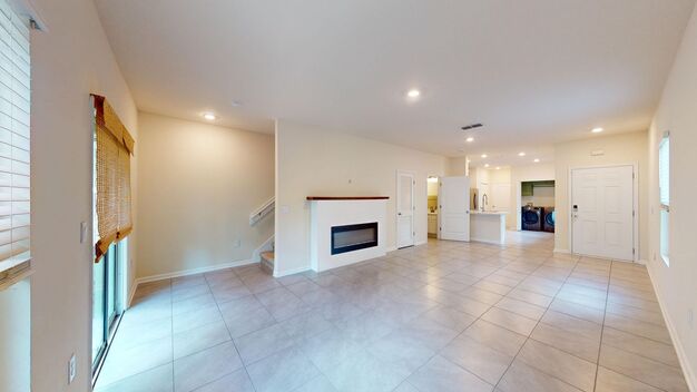 The open-concept main floor features durable tile flooring throughout, a spacious living area with a built-in electric fireplace, and a stylish kitchen complete with white cabinetry, stainless steel appliances, and a convenient laundry closet with washer and dryer included. A half bathroom is also located downstairs for guests.