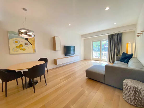 a beautifully appointed 1-bedroom, 1-bath residence offering serene river views and exceptional privacy. Located above street level, this thoughtfully designed unit features custom blackout drapery and premium Hunter Douglas shades that allow natural light while maintaining complete privacy ideal for city living without compromise. The entryway boasts a spacious built-in shoe cabinet and a sleek winter coat/storage closet for optimal organization. The open living and dining areas are illuminated by dimmable ceiling and pendant lights, creating the perfect ambiance for relaxing or entertaining. A dedicated office nook includes a dimmable built-in light for enhanced focus and comfort. The modern kitchen is fully equipped with built-in appliances, including a refrigerator, microwave, dishwasher, and custom utensil organizers. Hidden garbage bins keep the space clean and clutter-free.