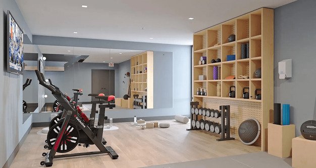 The building offers amazing amenities including an outdoor lounge with landscaping and dog run, game room, indoor lounge, two fitness centers, coworking space, and a rooftop terrace with views of the Manhattan skyline, seating, and barbecue grills.