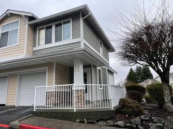 CLICK "REQUEST A TOUR" NOW! Top-floor corner unit with Cascades and Mt Rainier view! Spacious layout with high ceilings, fireplace, kitchen with eating bar and a sunny, south-facing deck. Two bedrooms, two full baths. Master suite with walk in closet, double sinks and soaking tub. Individual one-car garage. 3 minutes walk to playground. Great location close to Amazon fulfillment center, Angle Lake light rail station. Easy access to I-5 and 167.