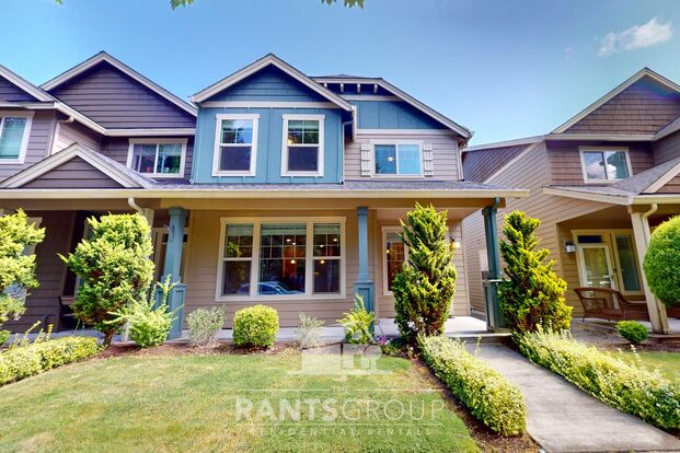 Gorgeous recently upgraded townhome with three bedrooms and 2.25 bathrooms, a 2-car garage, and A/C provided! Boasting an open concept main floor with engineered hardwood floors, granite slab countertops with slate backsplash, stainless steel appliances, and vaulted ceilings. The kitchen downstairs opens to the dining area, living room, and an eating bar. The primary bedroom upstairs is completed with a gorgeous bathroom and walk-in closet. The laundry room is conveniently located upstairs with a full guest bathroom down the hall, next to the two other bedrooms. The 2-car garage has built-in shelving and backs up to a small park with walking trails.