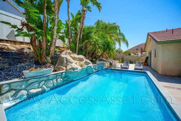 Charming 3 Bed/2 Bath Home With Private Pool in Lake Elsinore! As you enter the front door into a spacious living room, you will find a cozy fireplace creating a warm and inviting atmosphere. This room flows effortlessly into the dining area. Towards the kitchenYou'll love the abundant cabinetry, providing ample storage for all your culinary essentials. The large window overlooking the pool area floods the space with natural light, offering a delightful view while you cook. As you explore further, you find the master bedroom, a serene retreat with double French doors that lead directly to the expansive backyard. The ensuite bathroom features dual sinks, a separate toilet, and a walk-in shower area, providing both convenience and luxury. Outside you will find a beautiful backyard. Here, your private oasis awaits with a sparkling pool, perfect for relaxing and entertaining. This space is designed for enjoyment, offering a tranquil escape from everyday life. This home offers an attached two-car garage, providing secure parking and additional storage. Lake Elsinore boasts breathtaking views and numerous outdoor activities, including boating, fishing, and hiking, perfect for nature enthusiasts. Enjoy local parks, sports fields, and community events that foster a friendly and welcoming atmosphere. With shopping centers, restaurants, and schools nearby, everything you need is within easy reach, making daily life convenient and stress-free. Don't miss out on the opportunity to make 3484 Cherry Blossom Lane your new home. Contact us today to schedule a tour and experience the charm and comfort of this beautiful property!