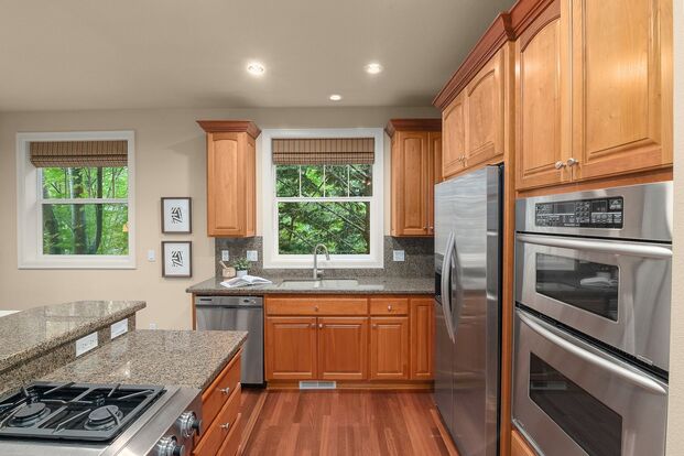 ✔ Gourmet Chef’s Kitchen – Granite counters, cooking island, 45” 6-burner gas range, eating bar, pantry, and downdraft venting.