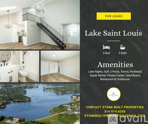 Amazing 3 bedroom, 2 bathroom duplex in Lake Saint Louis. Amenities included: central air, central heat, dishwasher, hardwood floors, pool, stainless steel appliance, updated kitchen, updated bathroom, storage, washer dryer, yard, lake access, clubhouse, sand beach, kayak rental, tennis, pickleball, golf, garage parking, and fitness center. No Utilities included, lawn cutting included. Is pet friendly. Date Available: Dec 1st 2025. $2,200/month rent. $2,200 security deposit required. Please contact Stone Built Properties at stonebuiltproperties@gmail.com or 314.974.8250 to learn more. This property is managed by a responsible landlord using Avail landlord software.