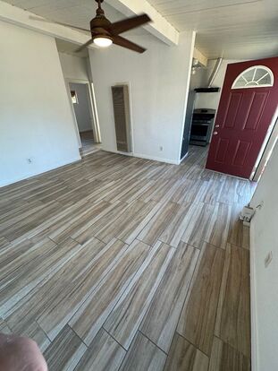 As you enter the home from the front door into the living room you will see abundant natural light. The living room has a ceiling fan, exposed wood beam ceiling (painted white) and neutrally colored wood-plank style flooring.