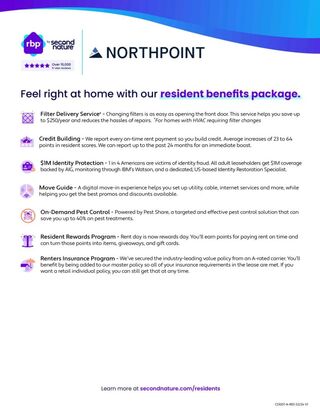 Includes: Renters Insurance, Pest Control, Filter Delivery, Resident Rewards Program (Points for paying rent which can then be redeemed for rewards), Credit Building, $1,000,000 Identify protection, Move-in Concierge (Utilities, Cable, and Internet)