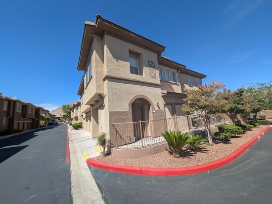 Fully remodeled 3-bedroom condo available for rent in the gated Lone Mountain community. Thoughtfully updated throughout with fresh paint, stylish matte black hardware, recessed lighting, ceiling fans, and custom red oak stair treads with modern cable railing. Both bathrooms have been beautifully renovated with updated vanities, tile, mirrors, and lighting. The primary suite includes a custom walk-in closet, and the kitchen features quartz countertops, a sleek backsplash, and updated cabinetry hardware. The layout feels open and bright with the removal of a pony wall and fireplace, creating a seamless living space. Enjoy mountain views and stunning sunsets just outside your door. Community amenities include a pool, spa, fitness center, and proximity to Majestic Park and scenic hiking trails. Quality finishes and thoughtful design make this home stand out—Lone Mountain living at its best!