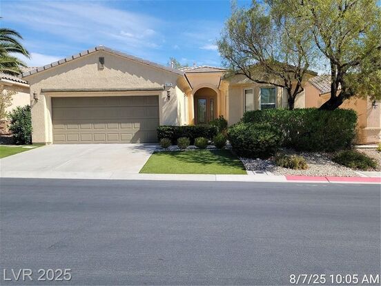 SUN COLONY AT SUMMERLIN – SINEA AGE RESTRICTED (55+) LUXURY LIVING! Beautiful and spacious 2 bed, 2 bath + den single-story in this premier active 55+ community. Open great room with dining area leads to a chef’s kitchen featuring granite counters, island, breakfast bar, stainless appliances, and plenty of prep space. Primary suite offers backyard access, walk-in closet, dual sinks, and walk-in shower. Secondary bedroom with nearby bath, plus a versatile den/office. Ceiling fans throughout. Attached 2-car garage with large storage room. Low-maintenance backyard with covered patio—enjoy the lush landscape and watch local wildlife while you relax. Small pet considered. Enjoy community access to the renowned Siena Golf Club and on-site bistro.