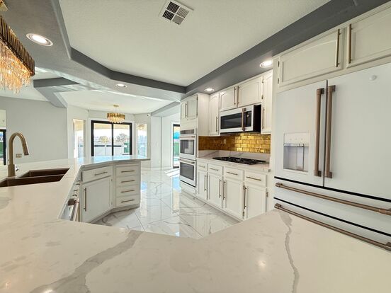 Nestled in a peaceful neighborhood, this modern and highly upgraded 5-bedroom, 3-bathroom home offers nearly 4,000 square feet of luxury living. No expense was spared in renovations, creating a stylish and functional space. Arrive inside to an open floor plan with views of the private pool and lush grassy yard.