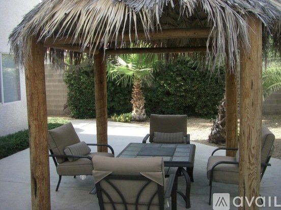 Private back yard with tropical Tiki hut and Palm trees