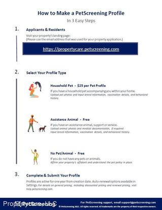 PetScreening is required for all applicants whether you have a pet or not @ https://propertycare.petscreening.com. There is a $25.00 fee for all sets of applicants whom have pets. Please get started by selecting a profile category on our landing page. Copy and paste the following link in another tab: https://propertycare.petscreening.com/