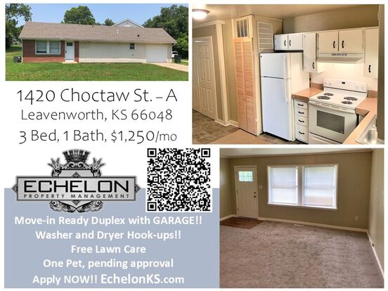 3 Bed, 1 Bath - GARAGE and LAWN CARE!! - RANCH STYLE!! 3 bedrooms, 1 bath duplex. WASHER and DRYER Provided!! One-car garage. Large living room, great eat-in kitchen. FREE LAWN SERVICE!! No Pet. No Smoking. Professionally managed by Echelon Property Management, 913-705-0201. Apply at EchelonKS.com Rental qualifications: Credit score of about 600, no evictions within the past 7 years, at least 90 days income, household income of at least 3 times the rent, at least 18 years of age No Pets Allowed (RLNE4013388)