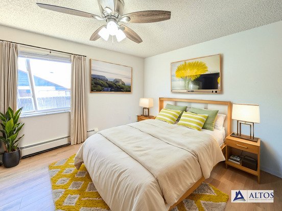 This spacious upstairs unit offers approximately 600 sf of living space, a large living/dining room area, an open kitchen, and a cozy bedroom.