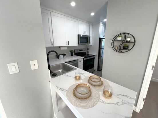 Include new hard surface flooring throughout, new baseboards and lighting that includes recessed lights in the living room and kitchen area. The bedroom has a beautiful hard wired ceiling fan. The kitchen is well appointed, it has all new shaker cabinets, quartz countertops, and appliances which include range, dishwasher, microwave, refrigerator, and garbage disposal. The bathroom also has new shaker cabinets, quartz countertops, light fixtures, and bathroom accessories. All new interior doors, and closet doors.