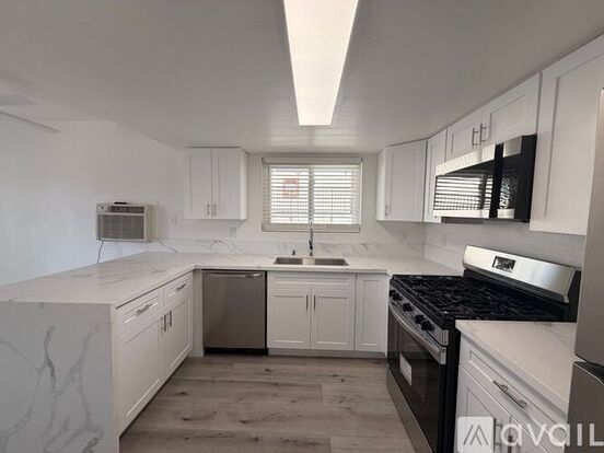 The unit showcases a renovated kitchen with shaker-style cabinets, quartz countertops, and brand-new stainless steel appliances, including a stove, refrigerator, dishwasher, and microwave. The bathroom has been thoughtfully upgraded with a new tub and modern fixtures, while wood-grain LVP flooring throughout the living areas adds a clean, contemporary feel.