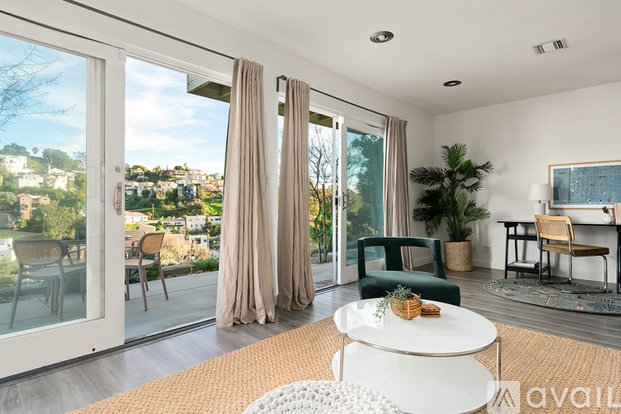Stunning 1+1 urban retreat in prime Silverlake location with gorgeous panoramic views. Nestled in the hills just 1 block south of the reservoir, this unit features a terraced backyard that provides privacy and tranquility while still within walking distance of the dog park, the meadow and some of Silverlake's best restaurants and shops. Lower unit in a small triplex building on a quiet residential hillside street with distinct entryways and singular unit-per-story layout optimizing privacy. Custom kitchen with gorgeous stone counters and stainless steel appliances, including upgraded French door refrigerator. Bathroom features same custom cabinetry as the kitchen and Kohler fixtures. Large laundry/storage room with stacked LG washer/dryer provides additional closet/storage space. Nearly new floors have had very gentle use. Private terraced yard has been landscaped, including timed irrigation and lighting, and will only get more beautiful as plants mature. Featuring walls of glass in the living room and bedroom - this sunny and bright unit is made to enjoy the indoor outdoor flow, as well as the neighborhood around it. Botanica, Bar Siesta, L&E Oyster Bar and Lamill Coffee are all just a couple blocks away. A little further down the street are Cafe Tropical, Silverlake Ramen, Bodega Park, Tacolina and Izakaya Ozen. Head north along the reservoir and you can walk to Whole Foods and Silverlake Wine. Sunset Junction and all of its shops and restaurants are also walkable, as are shops and restaurants on Rowena and Griffith Park. This is a unique property that must be seen to be appreciated.