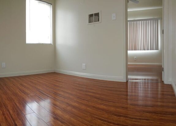 Wood flooring throughout the unit in the living and bedrooms.