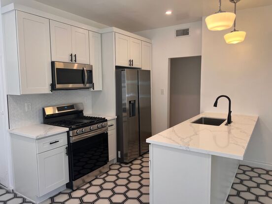 Located in a gorgeous neighborhood, this 1500 sqft apartment feels like a home! This restored unit features a large living room with a faux fireplace and vaulted ceilings. The kitchen features a large amount of storage space, original glass doors, an eat-in kitchen and room for an island. Appliances include a stainless steel refrigerator, stove and dishwasher.