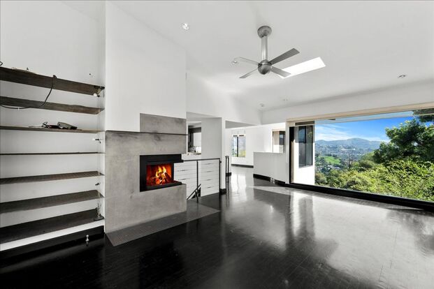 Nestled in the Hollywood Hills, this architecturally striking 4-bedroom, 3-bathroom contemporary home offers dramatic panoramic views and a flexible tri-level layout ideal for live/work creatives or anyone seeking both privacy and inspiration. Step into a sunlit living room with high ceilings, sleek black floors, a modern concrete fireplace, and an entire wall of glass that opens to sweeping views of the valley below. The kitchen features industrial style cabinetry, a gas range, and passthrough window to the dining area—perfect for entertaining.