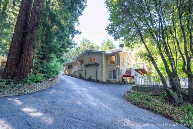 Easy circular driveway wraps around the house and has plenty of parking pads. No need to turn your car around as you can come in one way and exit the other way. Wonderful Santa Cruz Mountain community.