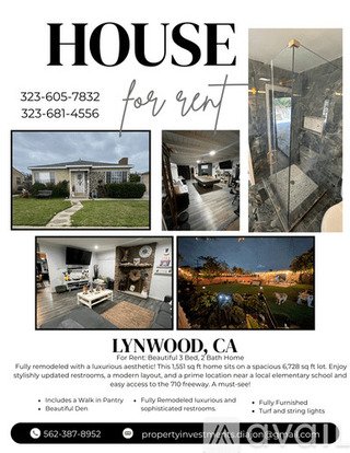 Amazing 3 bedroom, 2 bathroom house in Lynwood. Amenities included: updated bathroom, laundry in building, and yard. No Utilities included. Is pet friendly. Date Available: Aug 23rd 2025. $4,440/month rent. $4,440 security deposit required. Please submit the form on this page or contact Diana Jonathan Hernandez at 323-605-7832 to learn more. This property is managed by a responsible landlord using Avail landlord software.