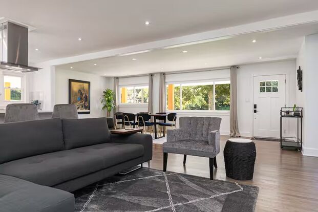 Modern Elegance: This modern home boasts an open floor plan in the main living space, ensuring a seamless flow of comfort throughout. Flat-screen smart TVs grace every room, while a welcoming dining room space sets the stage for shared moments.