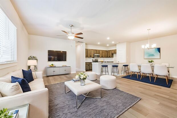 Modern 3-Bedroom Home with Open Layout and Island Kitchen INCLUDING REFRIGERATOR! This single-story home features an open floorplan with luxury vinyl plank flooring, granite countertops, tile backsplash, and stainless steel appliances. The oversized island kitchen provides generous prep and seating space, ideal for both everyday living and entertaining. High ceilings and recessed lighting add to the bright, open feel. All three bedrooms include ceiling fans, and the primary suite offers double sinks, an oversized walk-in shower, and a large walk-in closet. Additional highlights include brushed nickel hardware, a covered back patio, and a full sprinkler system in both front and back yards!