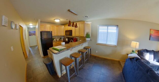 This apartment features a large living room perfect for entertaining guests. The kitchen features a refrigerator, dishwasher, stove, range, microwave, and bar. The bathroom features a double vanity then further down the hall is the washer and dryer, and at the end of the hall are the two bedrooms. This apartment has a patio and is close to Aggieville and Kansas State University Campus.