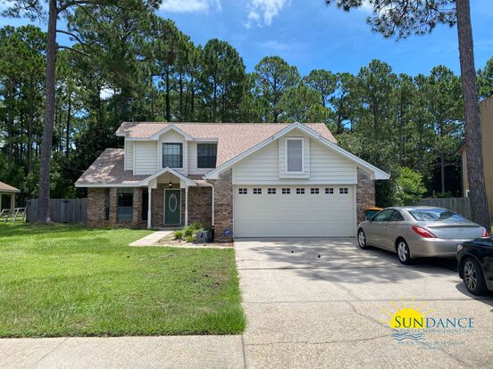 This stunning 3-bedroom, 2.5-bathroom rental in Mary Esther offers the perfect blend of comfort and convenience! Ideally located near Highway 98, you'll enjoy quick access to shopping, dining, and Hurlburt Field, making your daily routine a breeze. Step inside to a spacious living room featuring a cozy wood-burning fireplace, perfect for relaxing evenings. The full kitchen boasts granite countertops, stainless steel appliances, and ample cabinet space, while the adjoining dining area is ideal for family meals. With carpet upstairs, LVP and tile flooring throughout, trayed and vaulted ceilings, and a thoughtfully designed two-story split-bedroom floor plan, this home offers both style and functionality. The primary suite is a retreat with a walk-in closet, garden tub, and stall shower. Additional conveniences include a laundry room with washer/dryer AS-IS, security system AS-IS, and garbage disposal. Enjoy outdoor living with a open patio, and fenced backyard, offering the perfect setting for relaxation and entertainment. Parking is a breeze with a 2-car garage and driveway parking.