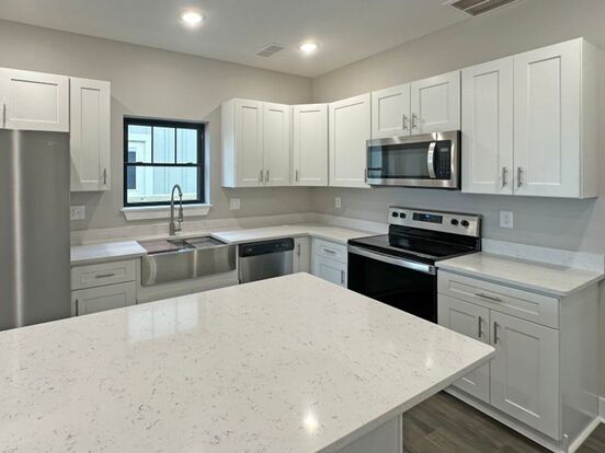 Step into modern elegance with this stunning three-bedroom, two-bathroom new construction townhouse in the highly sought-after Buffalo Creek Subdivision. From the moment you enter, you'll be captivated by the sleek design and thoughtful details that make this home a true gem. The kitchen is a chef's dream, boasting beautiful shaker cabinets, gleaming quartz countertops, and a striking stainless steel farm sink that combines both form and function. The generously sized bedrooms provide plenty of space to create your dream retreat, a productive workspace, or something in between. Storage won't be an issue, as the home also features thoughtfully designed additional storage options, ensuring you can keep your living space organized and clutter-free.