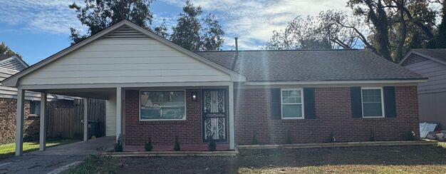 Welcome to this inviting single-story brick home featuring 3 bedrooms and 2 bathrooms, designed for comfort and easy living. A private side driveway leads to a convenient carport and an exterior storage closet, perfect for extra belongings. The quaint front porch sets a warm first impression before stepping inside.