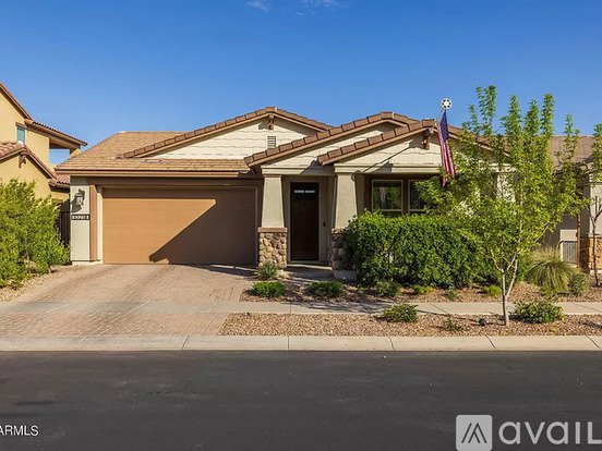 This breathtaking 4-bedroom, 3-bath single-story home, crafted by William Ryan Homes in 2020, spans 2196 sq ft of lavish living space. Revel in the magnificent split floor plan, showcasing a grand Chef's kitchen with quartz countertops, stainless steel appliances, a walk-in pantry, and an expansive island overseeing the inviting living and dining areas. Equipped with owned solar panels, relish in the modern amenities and prestige of Eastmark living. Complete with a private pool, this residence exudes elegance and comfort. Seize the opportunity to indulge in the epitome of Eastmark living!
