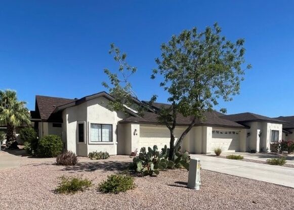 This gorgeous beauty is located in the Village at Apache Wells a 55+ community. The patio home has a split floorplan with a bedroom and bath on each side. A walk in shower in the primary bath. The kitchen boasts upgraded stainless appliances and granite counters and nice cabinets. All wood look vinyl plank flooring throughout. Washer-dryer is included. Outside is the large patio with epoxy flooring great for relaxing! Community Amenities include heated pools, clubhouse, fitness center and more!