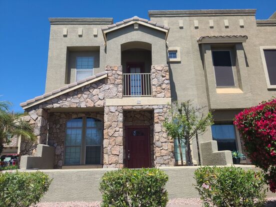 Coming Mid August. This beautiful Tuscan-style home features a charming wrought iron Juliet balcony off the master suite, custom paint throughout, and a built-in media center in the great room. Enjoy the professionally landscaped front courtyard and a spacious 2-car garage. Thoughtful upgrades include 36-inch maple cabinets, ceramic tile flooring on the main level, and more! This 3-bedroom, 2.5-bath home is ideally located near the Loop 202, offering easy access to the entire Valley.