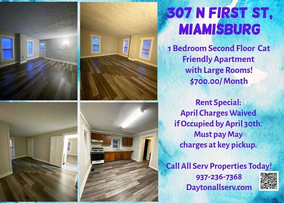 Welcoming upstairs apartment with large kitchen! 1 bedroom, 1bathroom located in Miamisburg, near North Main St. This unit is Cat Friendly (not dog friendly). Rent is $700.00/month, minimum security deposit equal to one month’s rent. Minimum household income requirement is 3x the monthly rent. 16 Month lease term required. Utilities are not included in rental price. Non-smoking unit. Section 8 not accepted. Applicants are required to complete a rental application and authorize a $40 credit and background check. Call All Serv Properties at 937-236-7368 to schedule a showing or visit our website, Daytonallserv.com for more information, additional photos, and online applications!