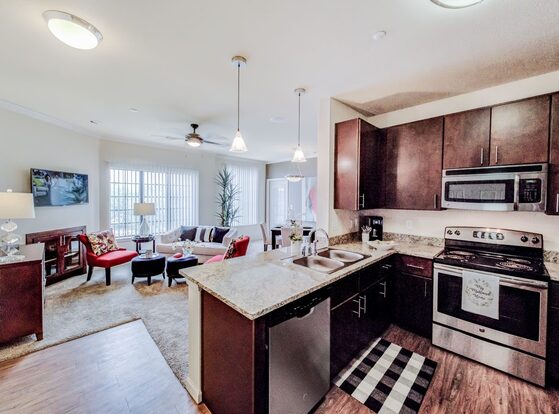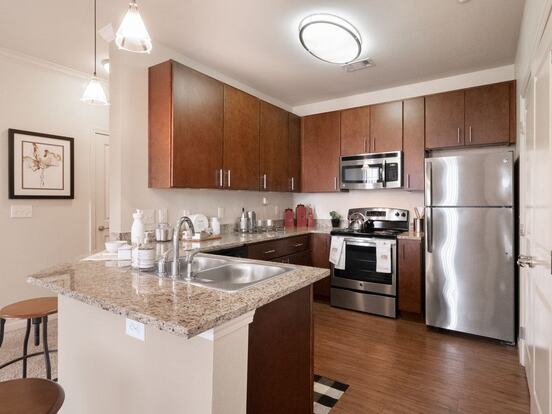 We offer spacious and beautifully designed 1, 2 & 3-bedroom floor plans with incredible amenities. You'll love the grand 9-foot ceilings adorned with lovely crown molding, elegant granite countertops in the kitchen and bathrooms, a custom built-in desk, your own washer and dryer, refreshing air conditioning, and so much more. We like to spoil our residents with outstanding community amenities including a state-of-the-art fitness center, stylishly furnished lounge, media center, and peaceful business center. We also take full advantage of the outdoors and have a gorgeous swimming pool, outdoor fireplace, barbecue areas, and an enclosed grassy park designated just for dogs!